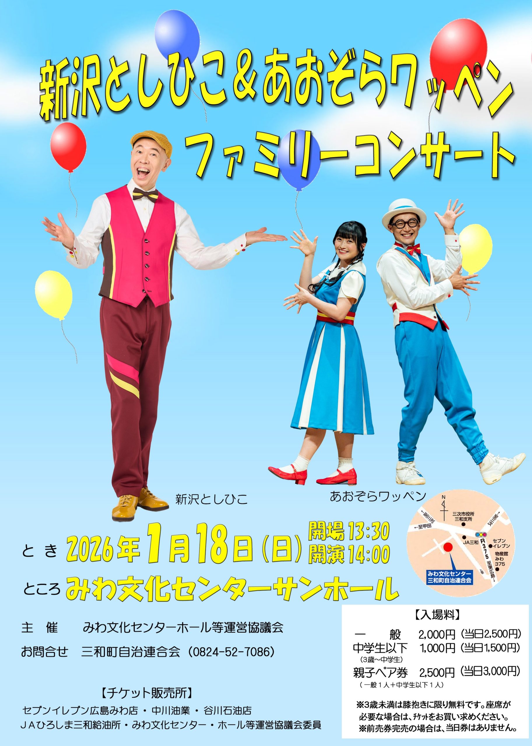 新沢としひこ&あおぞらワッペン ファミリーコンサート 公開日:2025年12月25日 三和情報三和町三和町地域情報三和町自治連合会上山上板木下板木敷名 2026年1月18日(日)みわ文化センターサンホールにて、新沢としひこさんとあおぞらワッペンさんをお招きして、ファミリーコンサートを開催します。 新沢としひこさんは、こどもたちや保育士さんたちにも大人気で、「虹」「はらぺ […] 続きを読む