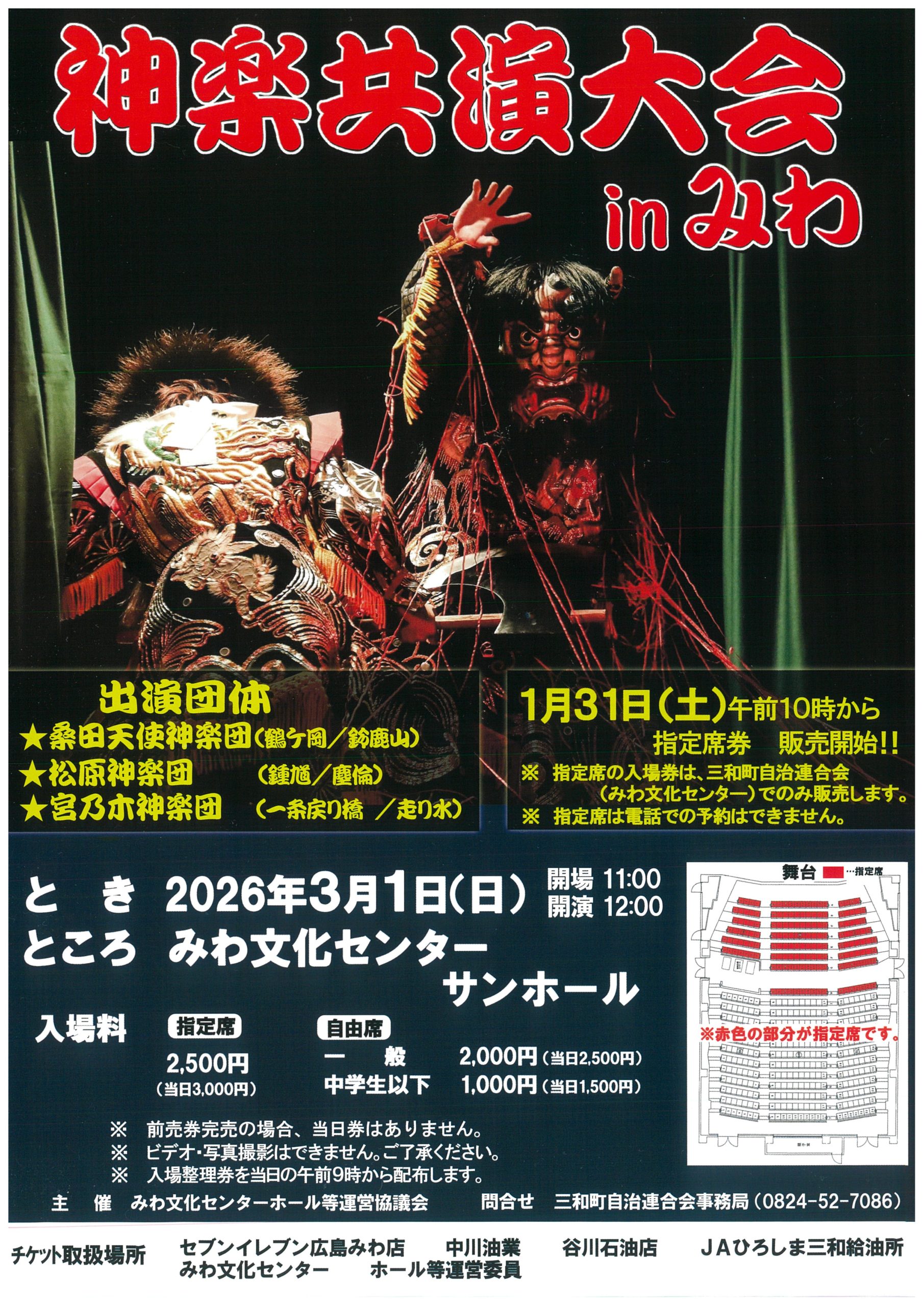 2026/3/1(日) 神楽共演大会inみわ 公開日:2026年1月28日 三和情報三和町三和町自治連合会上山上板木下板木敷名 今年も神楽共演大会を開催します! チケットの詳細について ※指定席の入場券を1月31日(土)午前10時から三和町自治連合会(みわ文化センター)でのみ販売いたします。 ※指定席の入場券は電話での予約は受けておりません。 指 […] 続きを読む