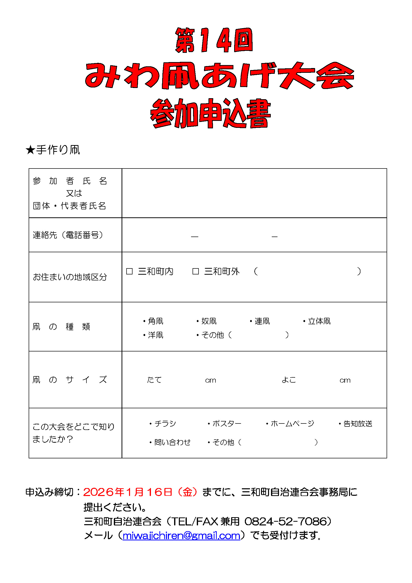 第14回 みわ凧あげ大会 参加者募集!! 公開日:2025年12月25日 三和情報三和町三和町地域情報三和町自治連合会上山上板木下板木敷名 2026年1月25日(日)三和総合運動公園陸上競技場にて、第14回みわ凧あげ大会を開催します。 町内外問わず、どこの地域からでも参加者していただけます! 参加申込書の締め切りは2026年1月16日(金)までとなっており、 三和町自治連合会【TEL/FAX兼用 0824-52-7086】 メール miwajichiren@gmail.com のどちらからでもお申込みいただけます。 みなさまのご応募お待ちしております♬ 関連記事 美波羅川千本桜開花状況(R3 4/1)2月24(土)サンホール体験会開催いたします!防災キャンプのおしらせ美波羅川千本桜開花状況(R4 3/30)美波羅川千本桜開花状況(R3 3/26)出張ピアノコンサートのおしらせ 投稿ナビゲーション 新沢としひこ&あおぞらワッペン ファミリーコンサート2026/3/1(日) 神楽共演大会inみわ