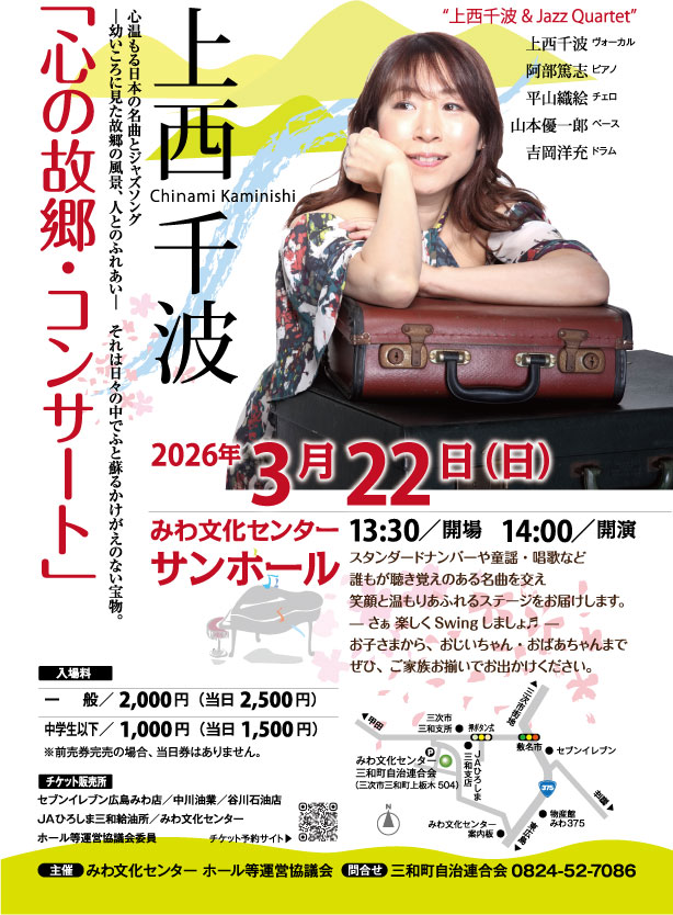 「心の故郷・コンサート」チケット予約 このフォームに入力するには、ブラウザーで JavaScript を有効にしてください。このフォームに入力するには、ブラウザーで JavaScript を有効にしてください。代表者名 *メールアドレス *ご予約の確認を送信いたします電話番号 *当日連絡可能な連絡先をご記入くださいお住まい(市町名) * 代表者名 中学生以下(前売券) 合計 一般(前売券)価格: ¥2,000012345678910中学生以下(前売券)価格: ¥1,000012345678910合計¥0送信 タグ みわ文化センター サンホール 三和町